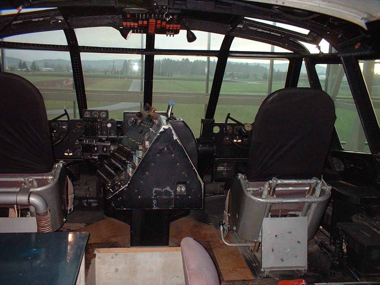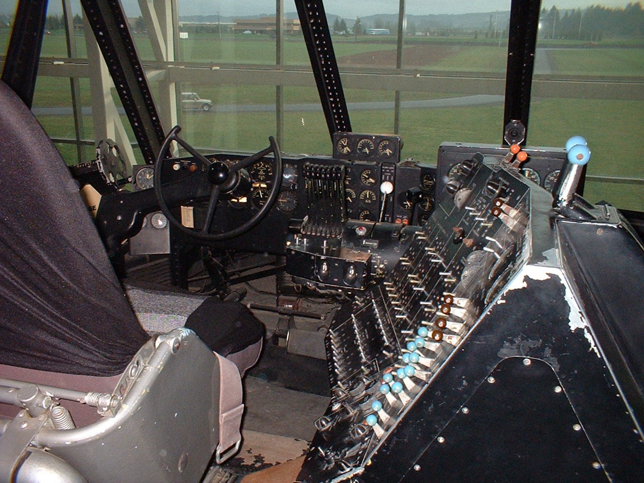 Pilot's seat. Howard Hughes sat on the left. Eight throttle levers are visible on both the pilot and co-pilot side, just inboard of the steering wheel/yoke.