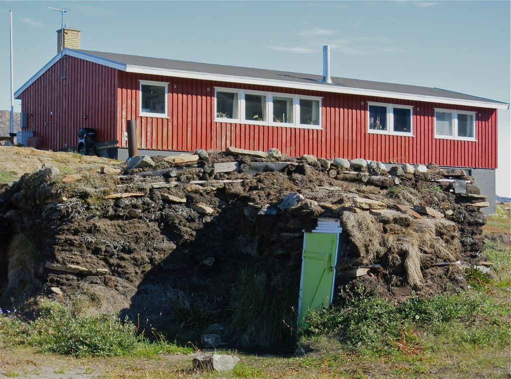In the foreground is a sod house once used by Inuit in summer months