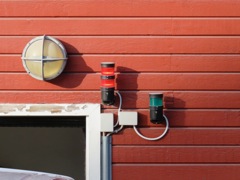 Water is delivered by truck. The lights indicate whether the tank needs filling.