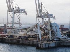 This crane was left with its brakes off one day. The wind blew it to the end of its track, where it collapsed. Oops.
