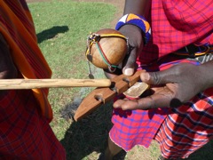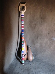 A walking stick and water flask. The beadwork is done by the women of the tribe