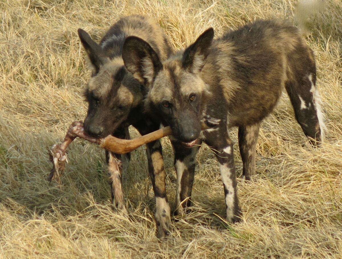 The puppies found an impala leg and very democratically broke it into 4 pieces so they could each have one.