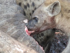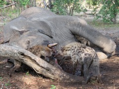 Hyenas eating a dead elephant. It probably died of natural causes.